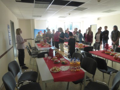Die Ökotrophologin, Frau Haase, war damit einverstanden, das Frühstück mit einer siebten Klasse der Sekundarschule durchzuführen. Die Schüler lernten Einiges über die Inhaltsstoffe verschiedener Lebensmittel, durften in einem Quiz den Fett- und Zuckergehalt verschiedener Lebensmittel abschätzen und im Anschluss richtig einordnen. Zum Abschluss wurde eine kleine Einkaufsrallye im REWE-Markt durchgeführt.
