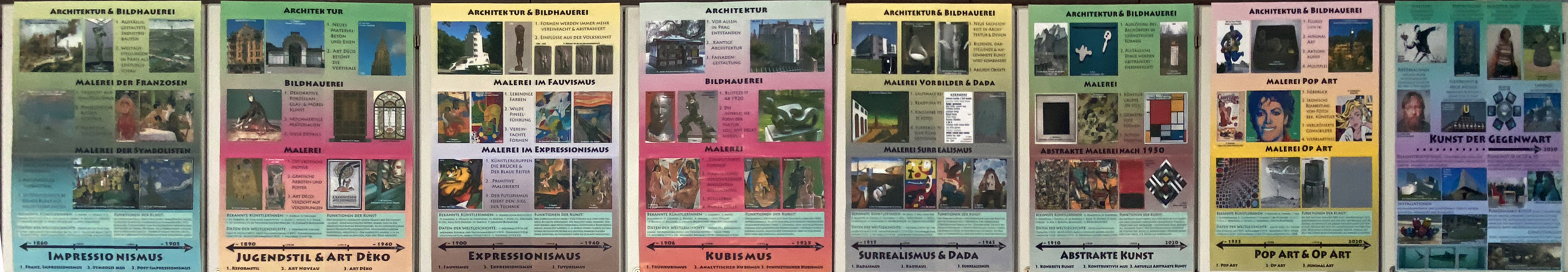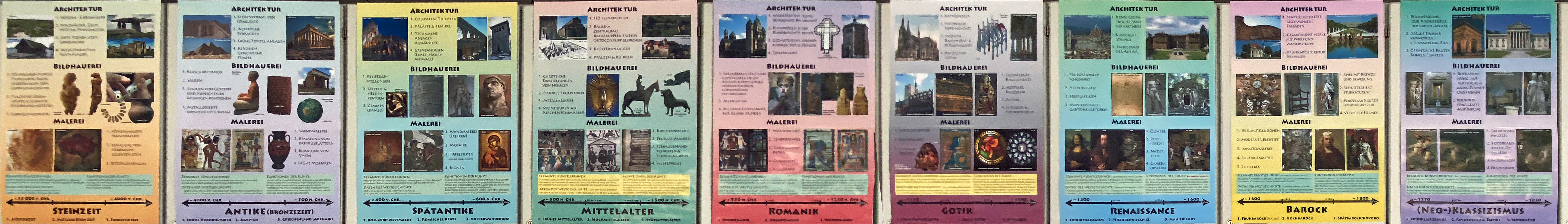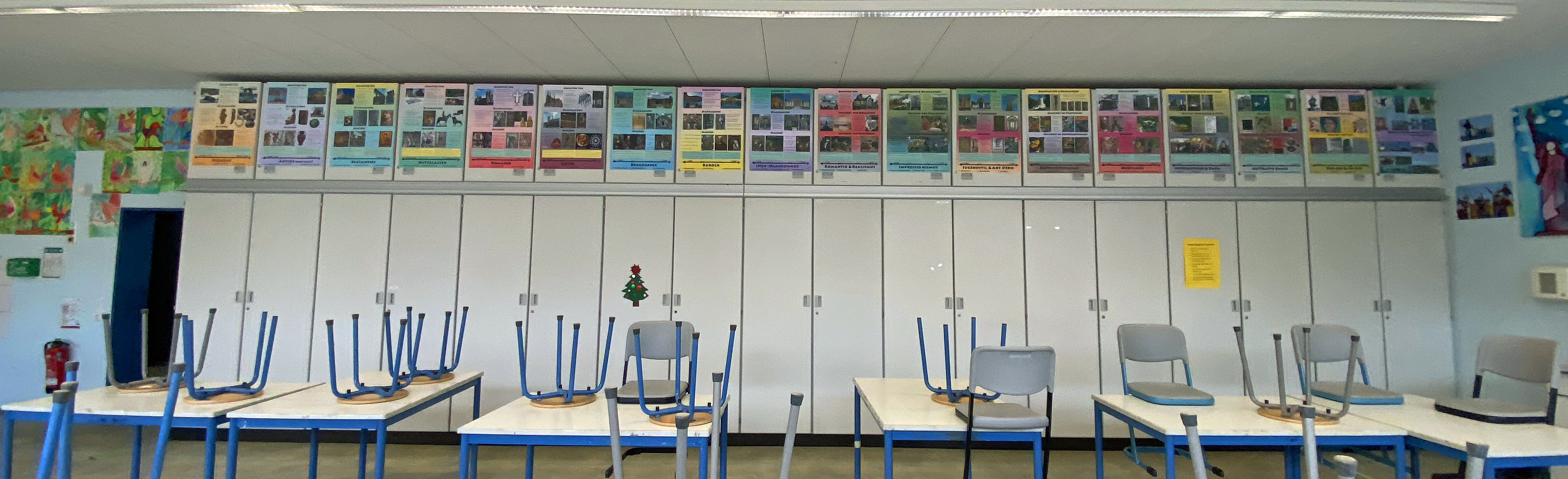 Da der Kunstraum 18 Oberschränke hintereinander hat, entschieden wir uns, die Geschichte der Kunst von der Steinzeit bis zur Gegenwart in 18 ca. DIN A0 großen Plakaten darzustellen. Herr Schonauer erstellte diese Plakate nach Absprache mit den Kunstlehrer*innen. Sie wurden ausgedruckt und auch in digitaler Form zur Verfügung gestellt. So können Schüler*innen und Lehrer*innen jederzeit auf die wichtigsten Informationen der Kunstgeschichte zugreifen, auch neben ihrer Arbeit an den Kunstprojekten in der Kunstgeschichte ‘stöbern‘ und sich Details an Einzelausdrucken und mit dem Beamer anschauen. Wir wünschen uns, das dieses Werkzeug von allen geschätzt und angewendet wird.