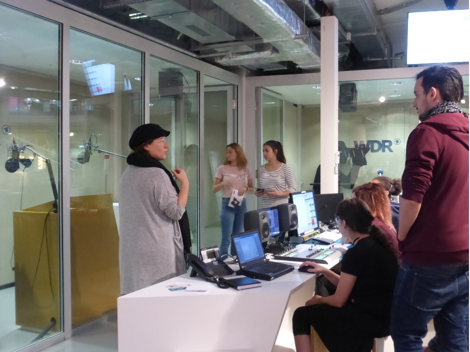 Am Mittwoch, den 11.10.2017 brach eine kleine Gruppe von 14 SchülerInnen nach Köln auf, um den Radiosender 1 Live kennen zu lernen und im Anschluss mit Hilfe der WDR-Mitarbeiter eine eigene, kleine Radiosendung zu erstellen. Da die Teilnehmerzahl von 16 unterschritten war, haben sich die WDR-Medienerzieher entschieden, die „Kurze Stundenuhr“ für die Vergabe der „Jobs“ zu wählen. Es erforderte sehr viel Mut von Seiten der SchülerInnen, sich für die „Jobs am Mikrophon“ zu melden, denn es waren 3 Mädchen in der Gruppe, die erst 1,5 bis 3 Jahre in Deutschland leben … ein Mädchen aus Armenien, eine aus dem Kosovo (Albanien) und eine aus Eritrea (Ostafrika). Alle drei trauten sich, am Mikrophon zu sprechen … eine lehrreiche Erfahrung, bei der sich die Fragen der Fremdsprache Deutsch von alleine, d.h. vor der Probeaufnahme und „Radioaufnahme“ ergaben.